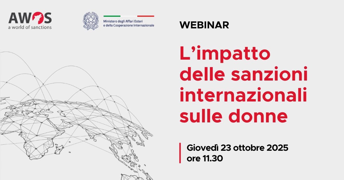Il webinar presenterà i risultati del progetto di ricerca “Prospettiva di genere e impatto delle sanzioni sulle donne, i minori e altri gruppi vulnerabili”, realizzato da AWOS con il contributo del Ministero degli Affari Esteri e della Cooperazione Internazionale*